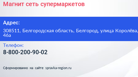 Магнит, сеть супермаркетов по адресу 308511, Белгородская область, Белгород, улица Королёва, 46а в дальнейшем Организация, размещена в следующих категориях: