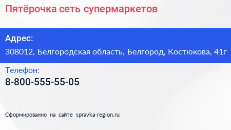 Пятёрочка, сеть супермаркетов по адресу 308012, Белгородская область, Белгород, Костюкова, 41г в дальнейшем Организация, размещена в следующих категориях: