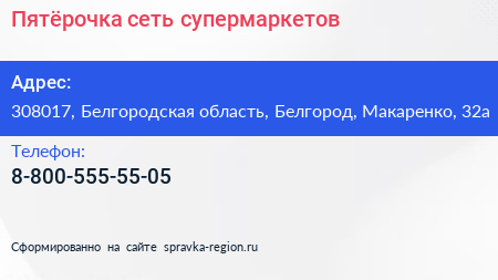 Пятёрочка, сеть супермаркетов по адресу 308017, Белгородская область, Белгород, Макаренко, 32а в дальнейшем Организация, размещена в следующих категориях: