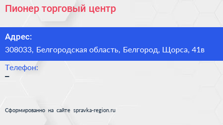 Пионер, торговый центр по адресу 308033, Белгородская область, Белгород, Щорса, 41в в дальнейшем Организация, размещена в следующих категориях: