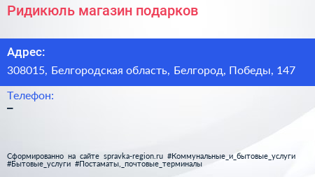 Ридикюль, магазин подарков по адресу 308015, Белгородская область, Белгород, Победы, 147 в дальнейшем Организация, размещена в следующих категориях: