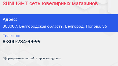 SUNLIGHT, сеть ювелирных магазинов по адресу 308009, Белгородская область, Белгород, Попова, 36 в дальнейшем Организация, размещена в следующих категориях: