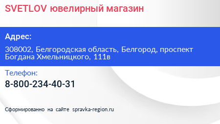 SVETLOV, ювелирный магазин по адресу 308002, Белгородская область, Белгород, проспект Богдана Хмельницкого, 111в в дальнейшем Организация, размещена в следующих категориях: