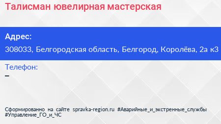 Талисман, ювелирная мастерская по адресу 308033, Белгородская область, Белгород, Королёва, 2а к3 в дальнейшем Организация, размещена в следующих категориях: