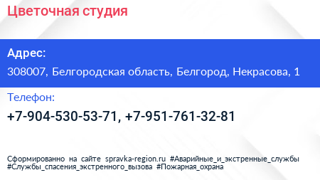 Цветочная студия по адресу 308007, Белгородская область, Белгород, Некрасова, 1 в дальнейшем Организация, размещена в следующих категориях: