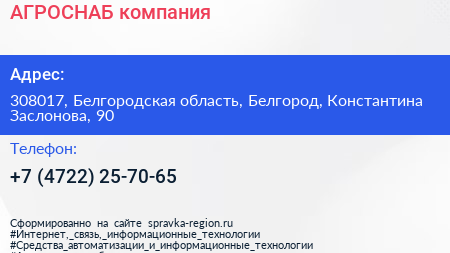 АГРОСНАБ, компания по адресу 308017, Белгородская область, Белгород, Константина Заслонова, 90 в дальнейшем Организация, размещена в следующих категориях: