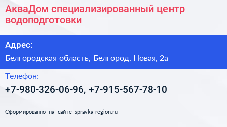 АкваДом, специализированный центр водоподготовки по адресу Белгородская область, Белгород, Новая, 2а в дальнейшем Организация, размещена в следующих категориях: