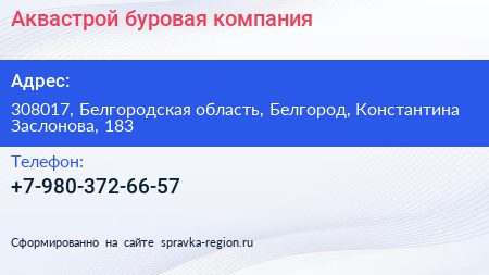 Аквастрой, буровая компания по адресу 308017, Белгородская область, Белгород, Константина Заслонова, 183 в дальнейшем Организация, размещена в следующих категориях: