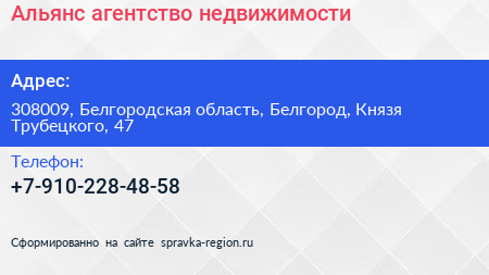 Альянс, агентство недвижимости по адресу 308009, Белгородская область, Белгород, Князя Трубецкого, 47 в дальнейшем Организация, размещена в следующих категориях: