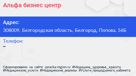 Альфа, бизнес центр по адресу 308009, Белгородская область, Белгород, Попова, 56Б в дальнейшем Организация, размещена в следующих категориях: