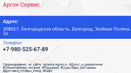 Аргон Сервис по адресу 308017, Белгородская область, Белгород, Зелёная Поляна, 2а в дальнейшем Организация, размещена в следующих категориях: