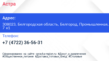 Астра по адресу 308023, Белгородская область, Белгород, Промышленная, 7 к1 в дальнейшем Организация, размещена в следующих категориях: