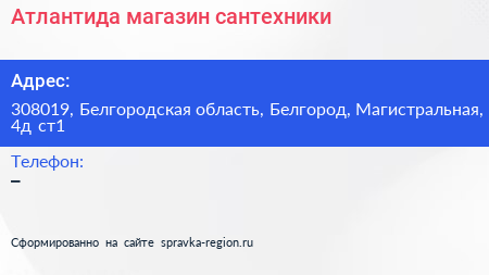 Атлантида, магазин сантехники по адресу 308019, Белгородская область, Белгород, Магистральная, 4д ст1 в дальнейшем Организация, размещена в следующих категориях: