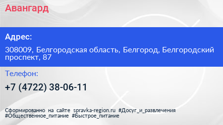 Авангард по адресу 308009, Белгородская область, Белгород, Белгородский проспект, 87 в дальнейшем Организация, размещена в следующих категориях: