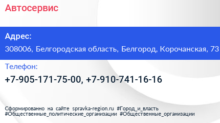Автосервис по адресу 308006, Белгородская область, Белгород, Корочанская, 73 в дальнейшем Организация, размещена в следующих категориях:
