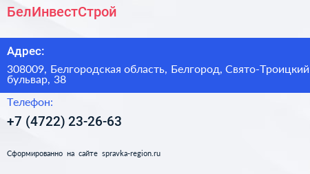 БелИнвестСтрой по адресу 308009, Белгородская область, Белгород, Свято-Троицкий бульвар, 38 в дальнейшем Организация, размещена в следующих категориях: