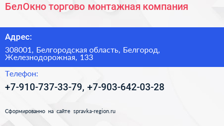 БелОкно, торгово-монтажная компания по адресу 308001, Белгородская область, Белгород, Железнодорожная, 133 в дальнейшем Организация, размещена в следующих категориях: