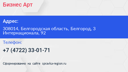 Бизнес & Арт по адресу 308014, Белгородская область, Белгород, 3 Интернационала, 92 в дальнейшем Организация, размещена в следующих категориях: