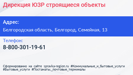 Дирекция ЮЗР, строящиеся объекты по адресу Белгородская область, Белгород, Семейная, 13 в дальнейшем Организация, размещена в следующих категориях: