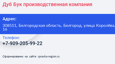 Дуб-Бук, производственная компания по адресу 308511, Белгородская область, Белгород, улица Королёва, 16 в дальнейшем Организация, размещена в следующих категориях: