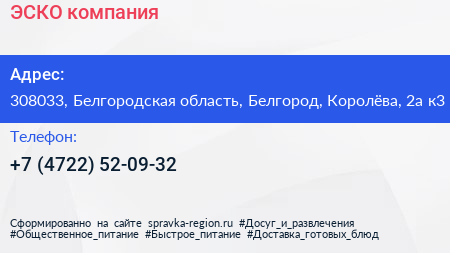 ЭСКО, компания по адресу 308033, Белгородская область, Белгород, Королёва, 2а к3 в дальнейшем Организация, размещена в следующих категориях: