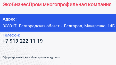 ЭкоБизнесПром, многопрофильная компания по адресу 308017, Белгородская область, Белгород, Макаренко, 14Б в дальнейшем Организация, размещена в следующих категориях: