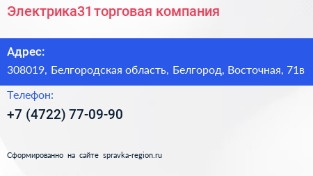 Электрика31, торговая компания по адресу 308019, Белгородская область, Белгород, Восточная, 71в в дальнейшем Организация, размещена в следующих категориях: