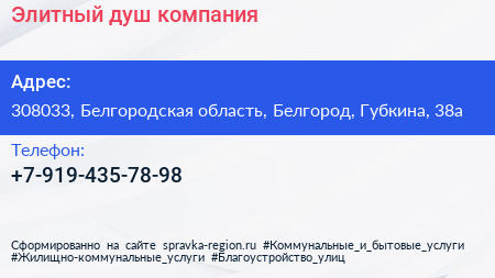 Элитный душ, компания по адресу 308033, Белгородская область, Белгород, Губкина, 38а в дальнейшем Организация, размещена в следующих категориях: