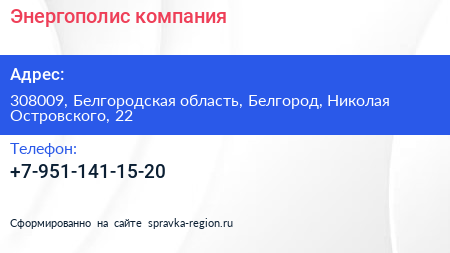 Энергополис, компания по адресу 308009, Белгородская область, Белгород, Николая Островского, 22 в дальнейшем Организация, размещена в следующих категориях: