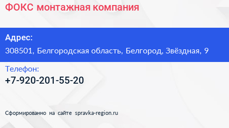 ФОКС, монтажная компания по адресу 308501, Белгородская область, Белгород, Звёздная, 9 в дальнейшем Организация, размещена в следующих категориях: