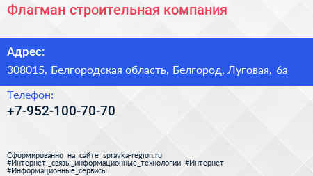 Флагман, строительная компания по адресу 308015, Белгородская область, Белгород, Луговая, 6а в дальнейшем Организация, размещена в следующих категориях: