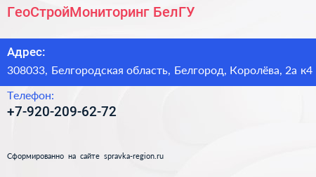 ГеоСтройМониторинг БелГУ по адресу 308033, Белгородская область, Белгород, Королёва, 2а к4 в дальнейшем Организация, размещена в следующих категориях: