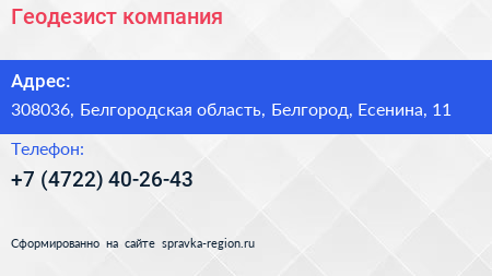 Геодезист, компания по адресу 308036, Белгородская область, Белгород, Есенина, 11 в дальнейшем Организация, размещена в следующих категориях: