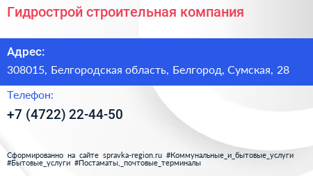 Гидрострой, строительная компания по адресу 308015, Белгородская область, Белгород, Сумская, 28 в дальнейшем Организация, размещена в следующих категориях: