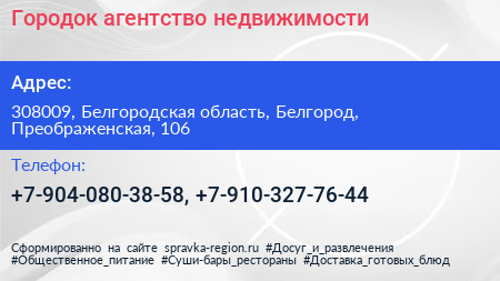 Городок, агентство недвижимости по адресу 308009, Белгородская область, Белгород, Преображенская, 106 в дальнейшем Организация, размещена в следующих категориях: