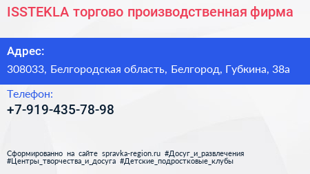 ISSTEKLA, торгово-производственная фирма по адресу 308033, Белгородская область, Белгород, Губкина, 38а в дальнейшем Организация, размещена в следующих категориях: