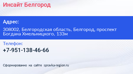 Инсайт Белгород по адресу 308002, Белгородская область, Белгород, проспект Богдана Хмельницкого, 133м в дальнейшем Организация, размещена в следующих категориях: