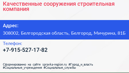Качественные сооружения, строительная компания по адресу 308002, Белгородская область, Белгород, Мичурина, 81Б в дальнейшем Организация, размещена в следующих категориях: