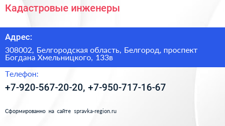 Кадастровые инженеры по адресу 308002, Белгородская область, Белгород, проспект Богдана Хмельницкого, 133в в дальнейшем Организация, размещена в следующих категориях: