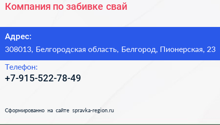 Компания по забивке свай по адресу 308013, Белгородская область, Белгород, Пионерская, 23 в дальнейшем Организация, размещена в следующих категориях:
