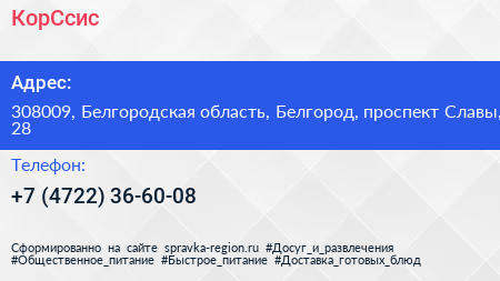 КорСсис по адресу 308009, Белгородская область, Белгород, проспект Славы, 28 в дальнейшем Организация, размещена в следующих категориях: