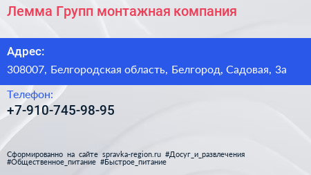 Лемма Групп, монтажная компания по адресу 308007, Белгородская область, Белгород, Садовая, 3а в дальнейшем Организация, размещена в следующих категориях: