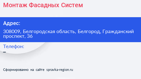 Монтаж Фасадных Систем по адресу 308009, Белгородская область, Белгород, Гражданский проспект, 36 в дальнейшем Организация, размещена в следующих категориях: