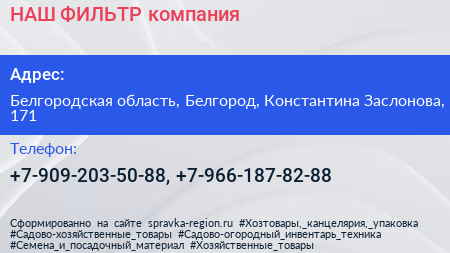 НАШ ФИЛЬТР, компания по адресу Белгородская область, Белгород, Константина Заслонова, 171 в дальнейшем Организация, размещена в следующих категориях: