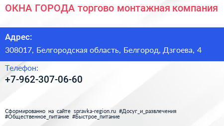 ОКНА ГОРОДА, торгово-монтажная компания по адресу 308017, Белгородская область, Белгород, Дзгоева, 4 в дальнейшем Организация, размещена в следующих категориях: