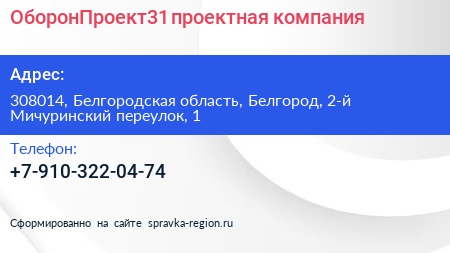 ОборонПроект31, проектная компания по адресу 308014, Белгородская область, Белгород, 2-й Мичуринский переулок, 1 в дальнейшем Организация, размещена в следующих категориях: