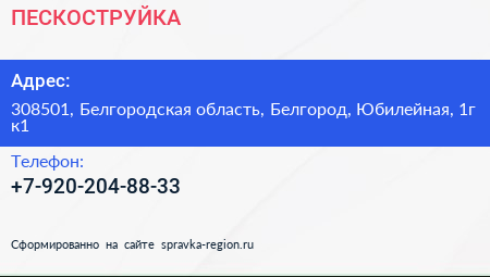 ПЕСКОСТРУЙКА по адресу 308501, Белгородская область, Белгород, Юбилейная, 1г к1 в дальнейшем Организация, размещена в следующих категориях:
