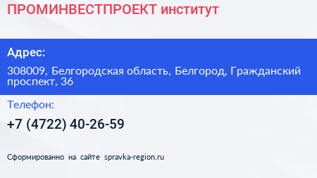 ПРОМИНВЕСТПРОЕКТ, институт по адресу 308009, Белгородская область, Белгород, Гражданский проспект, 36 в дальнейшем Организация, размещена в следующих категориях: