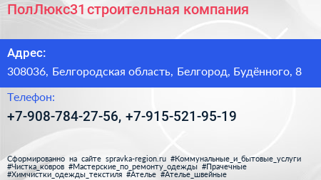 ПолЛюкс31, строительная компания по адресу 308036, Белгородская область, Белгород, Будённого, 8 в дальнейшем Организация, размещена в следующих категориях: