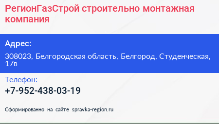 РегионГазСтрой, строительно-монтажная компания по адресу 308023, Белгородская область, Белгород, Студенческая, 17в в дальнейшем Организация, размещена в следующих категориях: